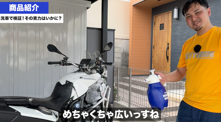 - 噴射! 実際に吹き付けてみると、その噴射範囲の広さに驚きました。壁に向けてテストしたところ、約75cm〜80cmほどの幅で噴射できました。 バイクであれば、片面を一気に泡だらけにでき、2〜3往復するだけで全体をカバーできます。泡切れも良く、スポンジで軽く磨いて水で流すだけでピカピカになりました。