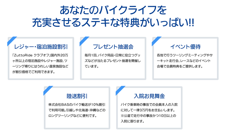 - レジャー・宿泊施設割引: 「ZuttoRide クラブオフ」を活用すれば国内外20万ヶ所以上の宿泊・レジャー施設が割引に。ツーリング帰りの温泉もお得に!