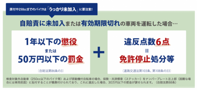 ※250cc以上の車両は車検時の諸費用などに自賠責保険の費用が含まれますので、お店などに車検を任せている場合は特に手続きなどを気にする必要はありません。
