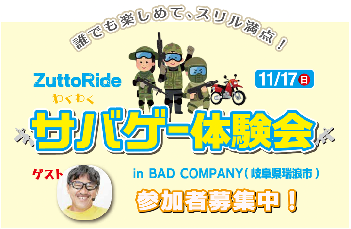 【開催終了】【11月17日】ZuttoRide サバゲー体験 in BAD COMPANY 岐阜県瑞浪市【ZuttoRide Club会員限定】