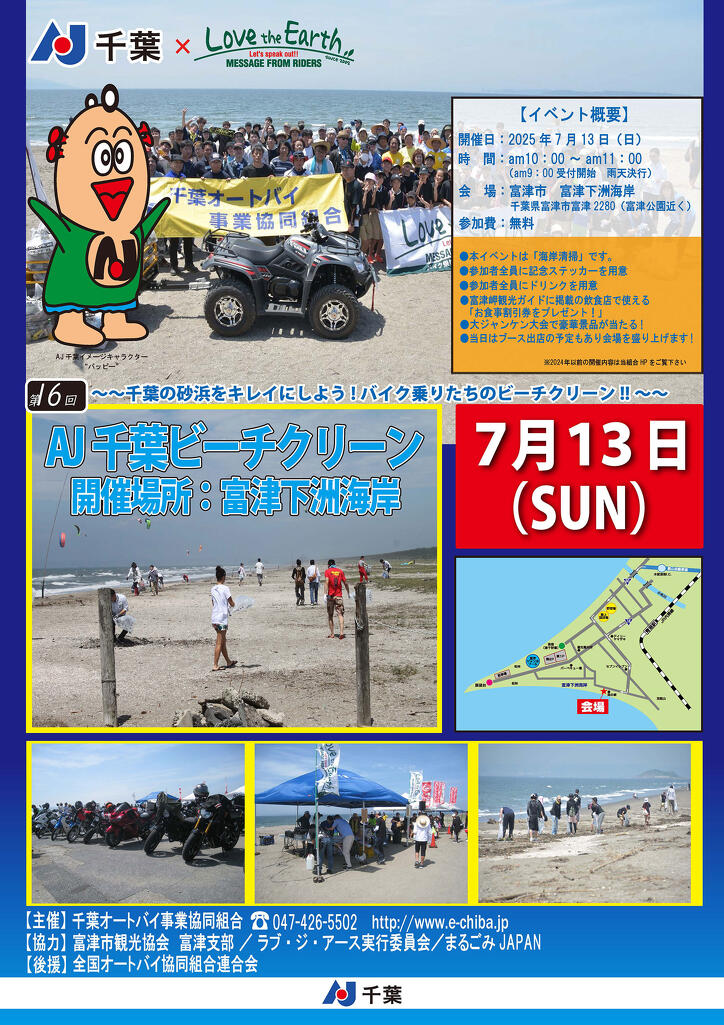 ビーチクリーンイベントとしては、16回目を迎える、千葉オートバイ事業協同組合と富津市観光協会 富津支部との共同イベント「AJ千葉ビーチクリーン2025 in 富津下洲海岸」が開催されます!
