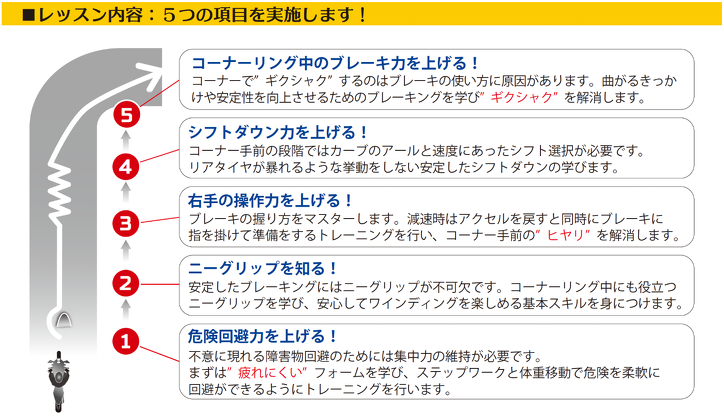 ワインディング攻略レッスンは、初級(超初心者)から、中級程度のライダーのスキルアップを目的とした基礎コースです。