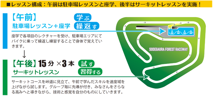 今年から1日カリキュラムになり、サーキット走行の時間も増量!