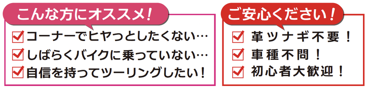 ツーリングで怖い思いをしたく無い方や、ライディングスクールを受講した事が無い方、ライディングに対する自信を取り戻したいリターンライダーなどを想定したカリキュラムとなっております。
