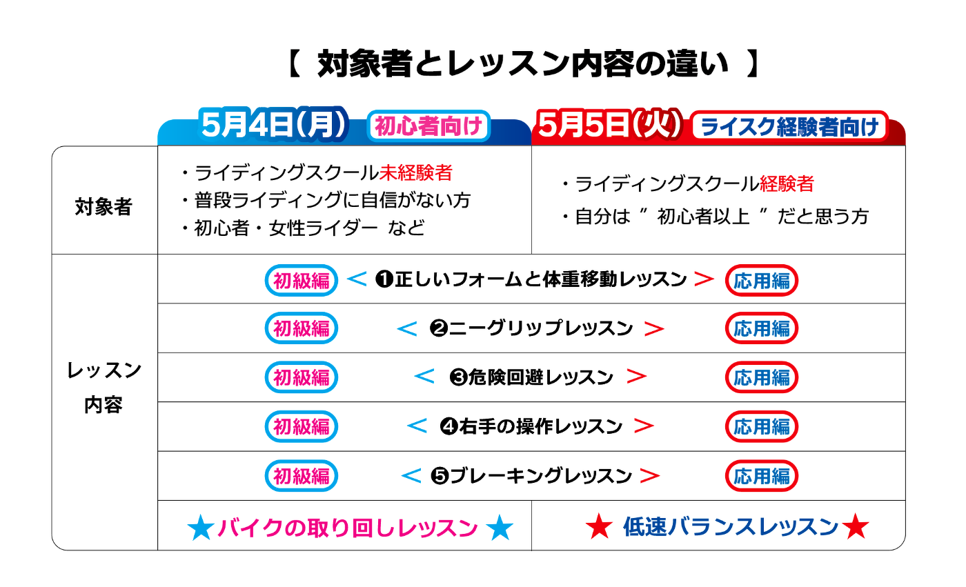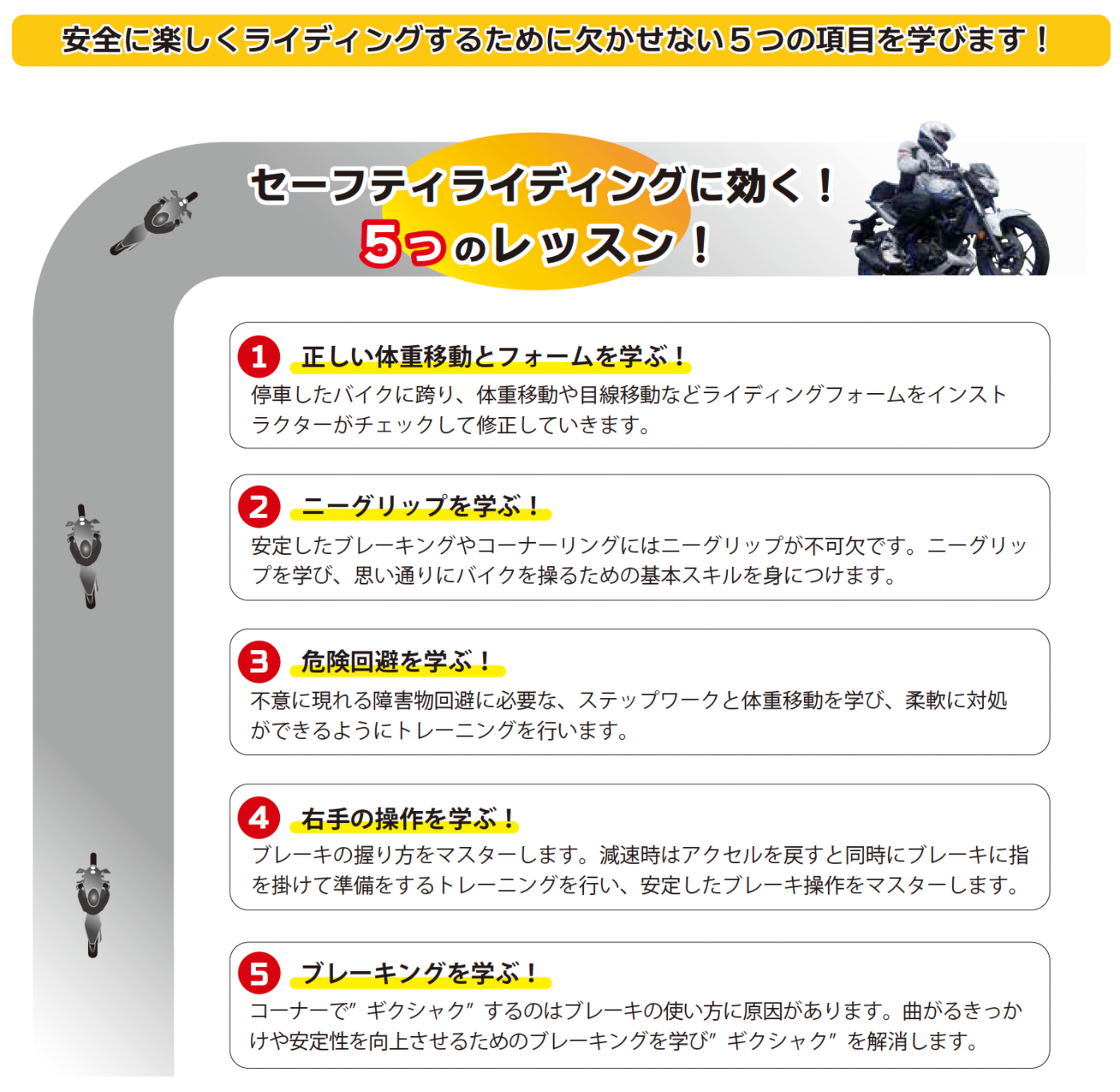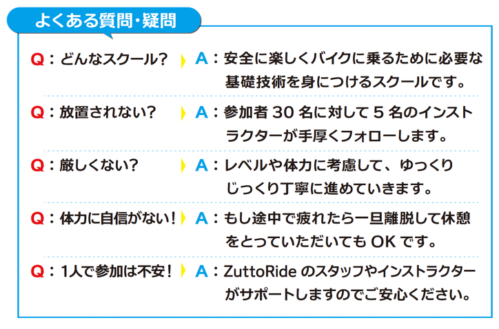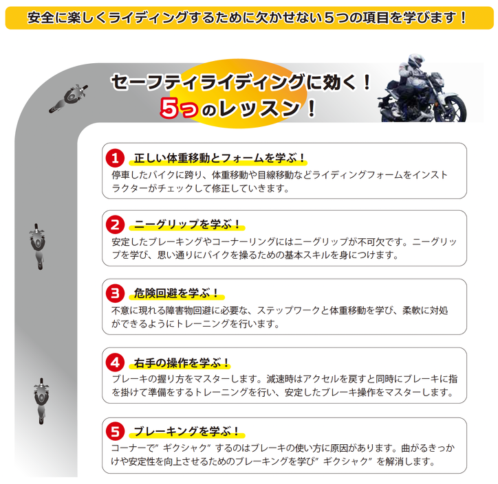 セーフティライディングレッスンは、初級(超初心者)ライダーのスキルアップを目的とした基礎コースです。