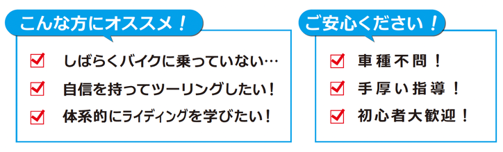 ツーリングで怖い思いをしたく無い方や、ライディングスクールを受講した事が無い方、ライディングに対する自信を取り戻したいリターンライダーなどを想定したカリキュラムとなっております。