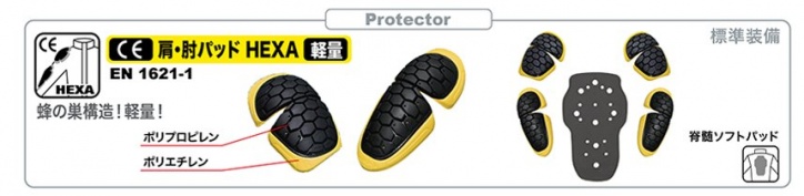 肩肘にCE(EN1621-1)規格の軽量型HEXAパッド、背中にソフト脊髄パッドを標準装備。