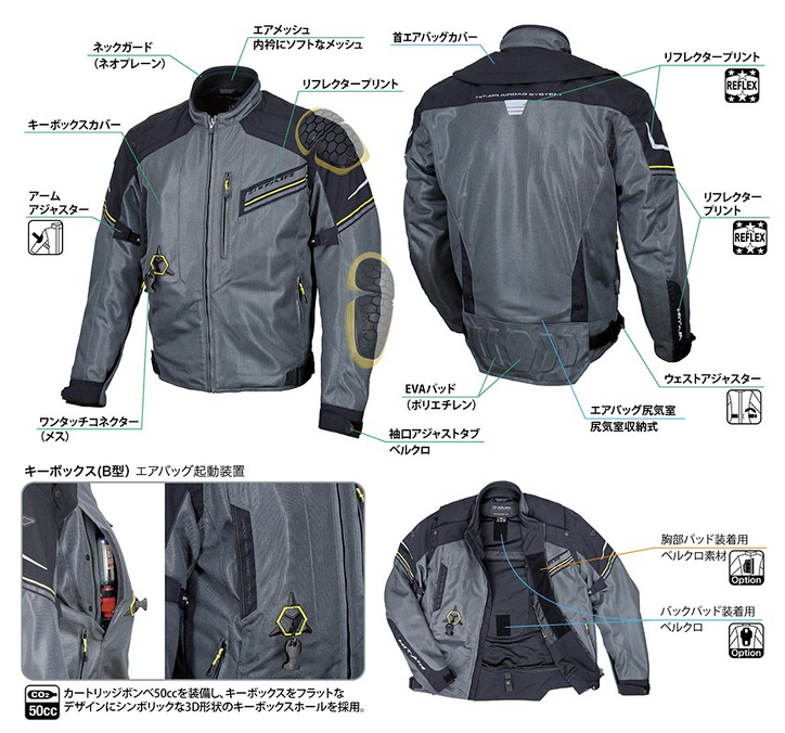 - SHOCK-BUFFERING SYSTEM(衝撃緩和保護システム・エアバッグシステム)は、ライダーがバイクから《一定の距離》離れた瞬間にキーボール(作動ピン)が抜け、キーボックス(起動装置)が作動しカートリッジボンベより炭酸ガス(CO2)が首気室・背中気室・胸気室・脇気室・尻気室へと送り込まれエアバッグが瞬時に膨張し、人体への衝撃を緩和するシステムです。