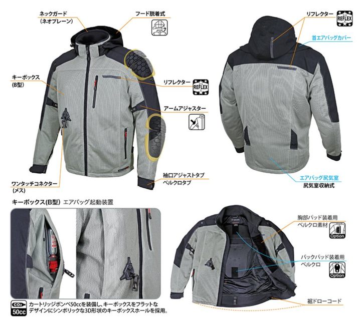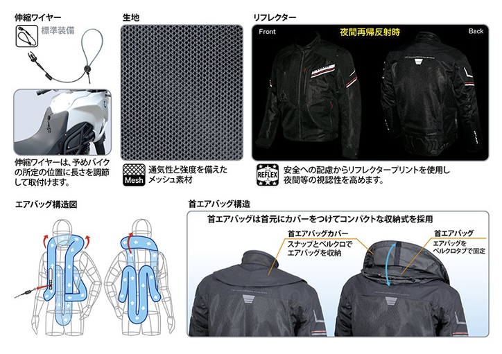 スポーティなデザインに各所にリフレクターを配置し、視認性を高めたエアバッグメッシュジャケット。