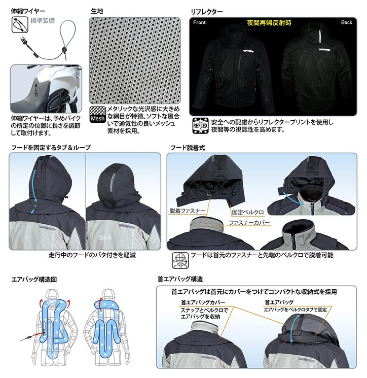 スポーツカジュアルスタイルと安全性を融合させたフーデッドエアバッグメッシュジャケット。