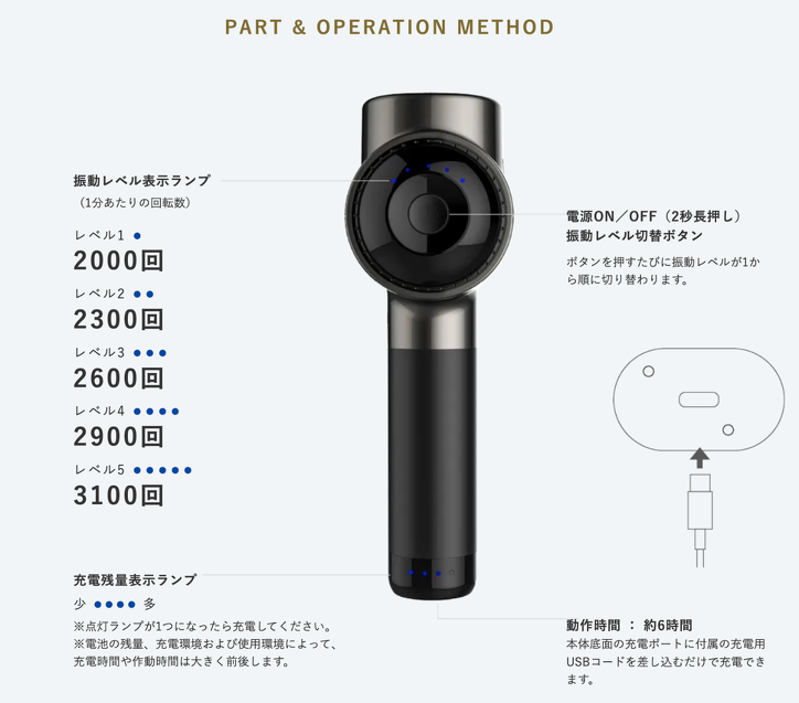 5段階の振動レベルで、お好みの強さに調節可能。1回の充電で、約6時間使用できるので、時間を気にせずリフレッシュできます。