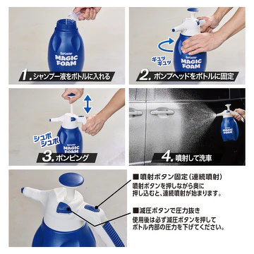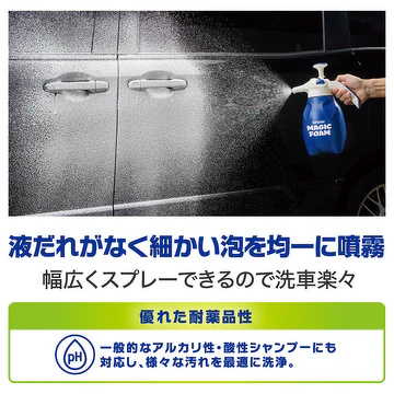 広範囲を瞬時にシャンプーできる蓄圧式フォームガン。水道や電源が不要で、どこでも手軽に泡洗車が可能です。ミニバンやSUVなどのルーフやガラスなどの手が届きにくい箇所もスムーズに洗浄できます。耐薬品性に優れているので3pH洗車にも対応いたします。