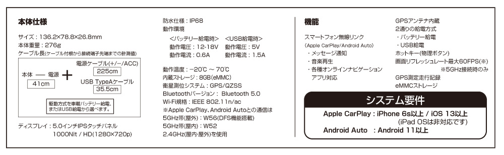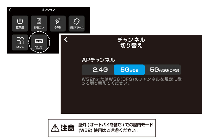 スマートフォンとモニターのリンクに使用するWi-fiの5GHz帯域に、W56に加えW52を搭載。Wi-fiに繋がりやすく、屋内でのFWアップデートが楽に行えます。また、屋内モード(W52)は自動車内にも適合されるので使用用途が広がります。