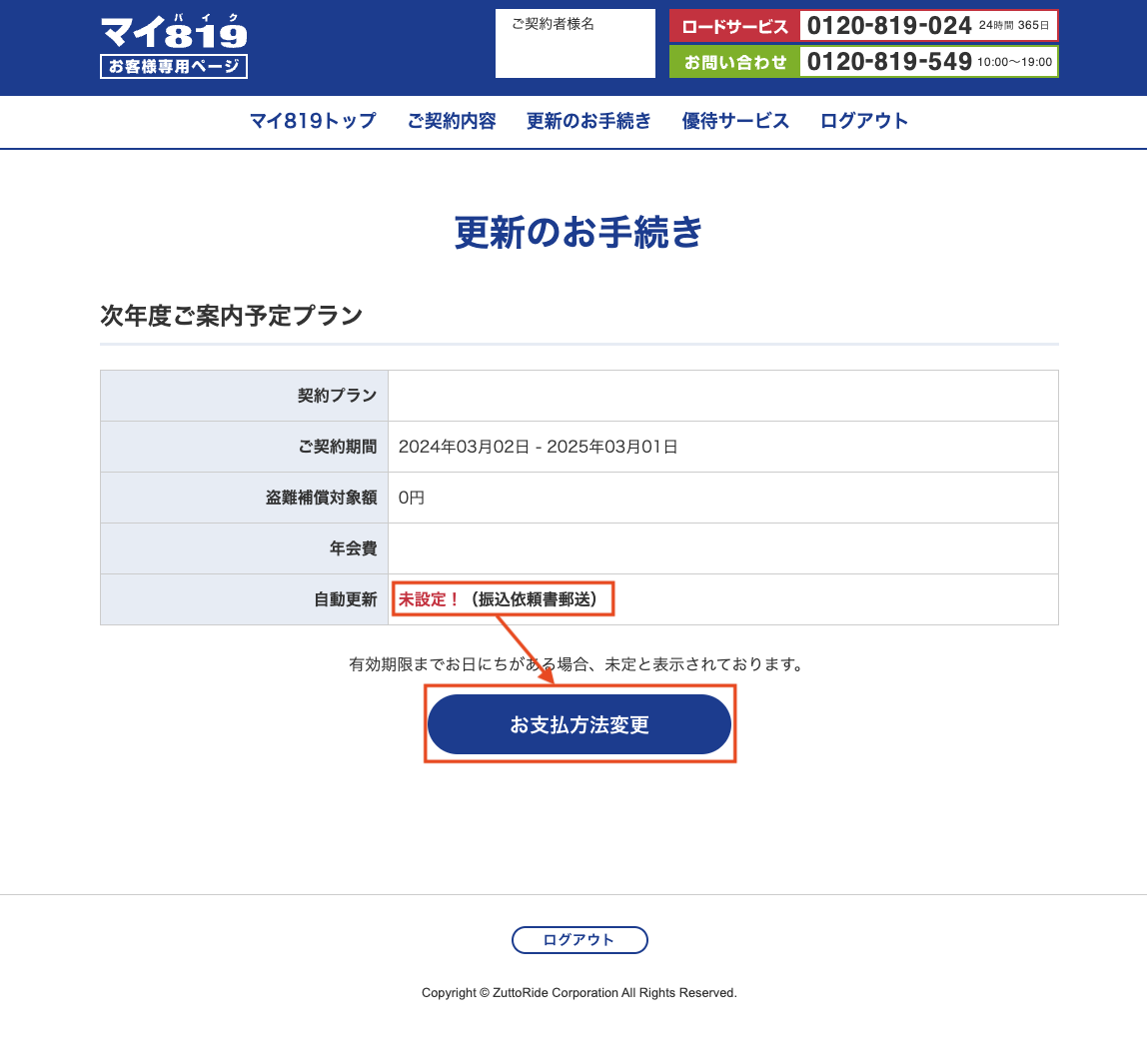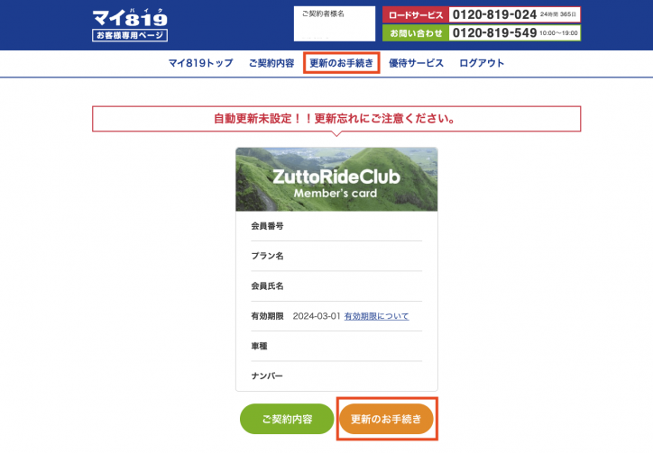 ※この時点で、「自動更新」欄が「クレジットカード」や「ネット口座振替」となっている場合は、自動継続の設定が完了しておりますので、ここ以降の作業は必要ありません。