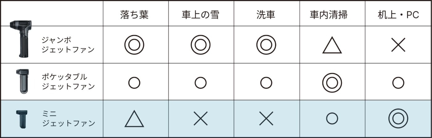 ポケットにおさまる手のひらサイズながら、1分間に130,000回転の超高速回転を生み出す強力なモーターによるジェット風圧で、洗車後の水滴飛ばしからホコリ取り、浮き輪の空気入れ、キャンプで使うエアマット、焚き火の火起こしなど、さまざまな用途で気軽にお使いいただけます。これ一台で、必要なときにどこでも便利にお使いいただけます。
